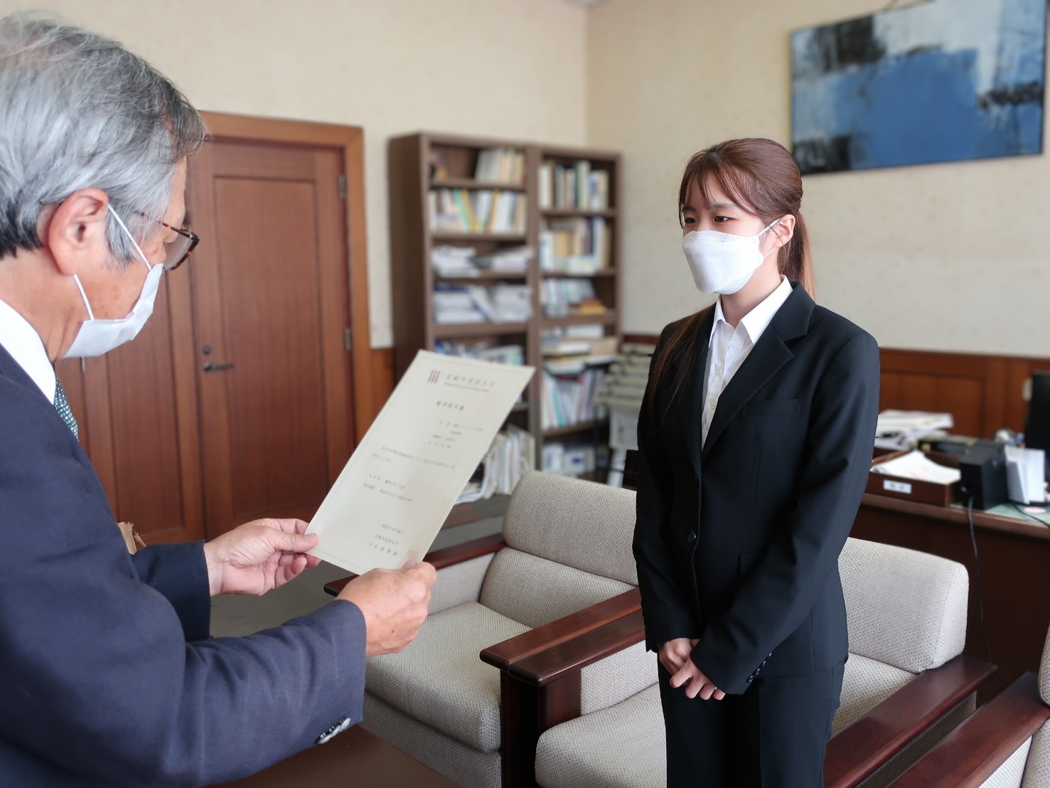 9月から廈門大学に留学する学生に対し、姫野学長より留学許可書が授与されました。今回派遣される学生は、中国政府の国費留学生に選ばれ、廈門大学に1年間留学します。