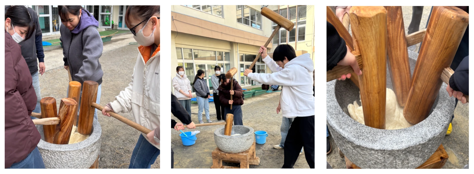 当日は、地域の方々のご指導のもと、初めは慣れない作業に戸惑う場面も見られましたが、次第に息を合わせ、笑顔で活動する様子が見られました。力を合わせてもちつきに取り組む中で、行事を支える一員として主体的に関わる姿が印象的でした。