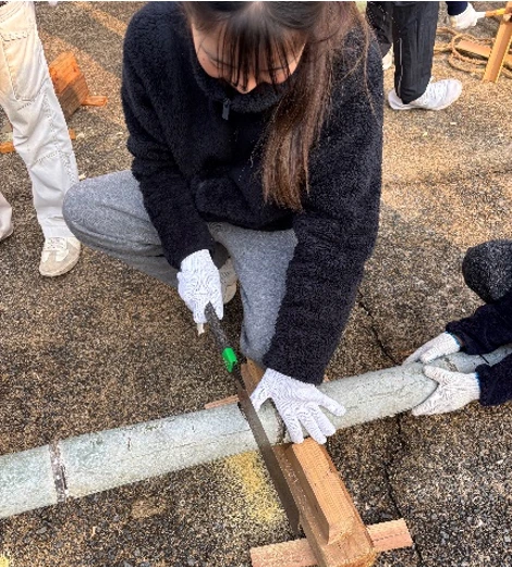 当日は、地域の方々や保護者の方々から門松づくりの意味や作り方について教えていただきながら、中学生と学生が一緒に作業に取り組みました。学生は、中学生の活動を見守りつつ、作業が進めやすいように声を掛けたり、必要に応じて手助けをしたりしながら、安心して取り組める雰囲気づくりに努めました。