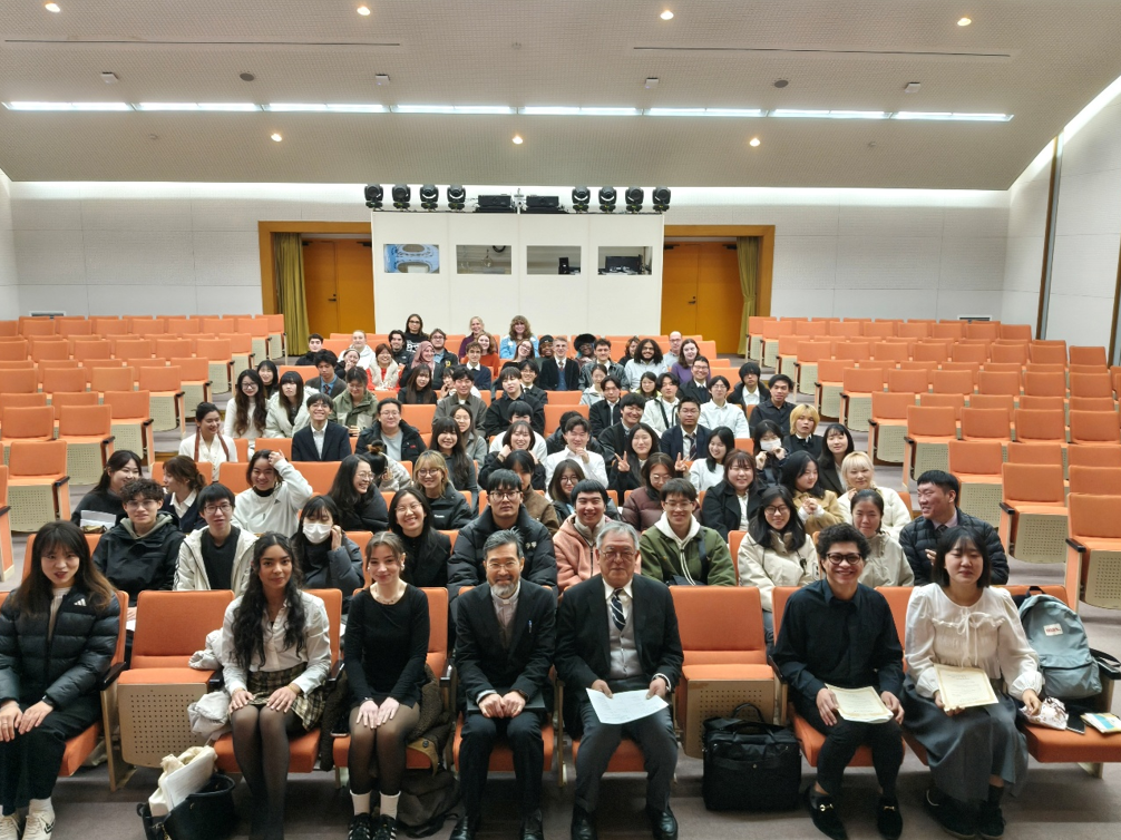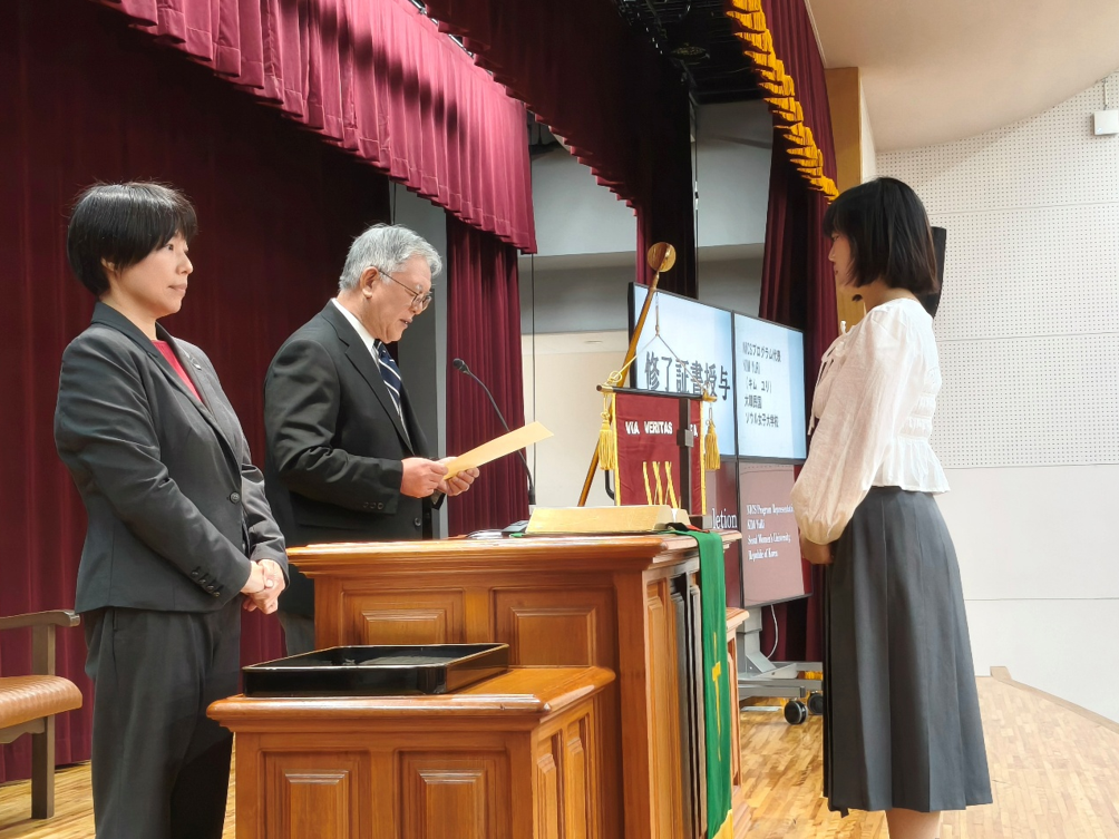 本学では、2026年1月28日、2025年度秋学期短期留学プログラム修了式を挙行しました。修了式では、104名の留学生を代表し、キム・ユリさん(韓国・ソウル女子大学校)とウィルソン・アンチュアンさん(アメリカ合衆国・ガバナーズ州立大学)が修了証書を受け取りました。