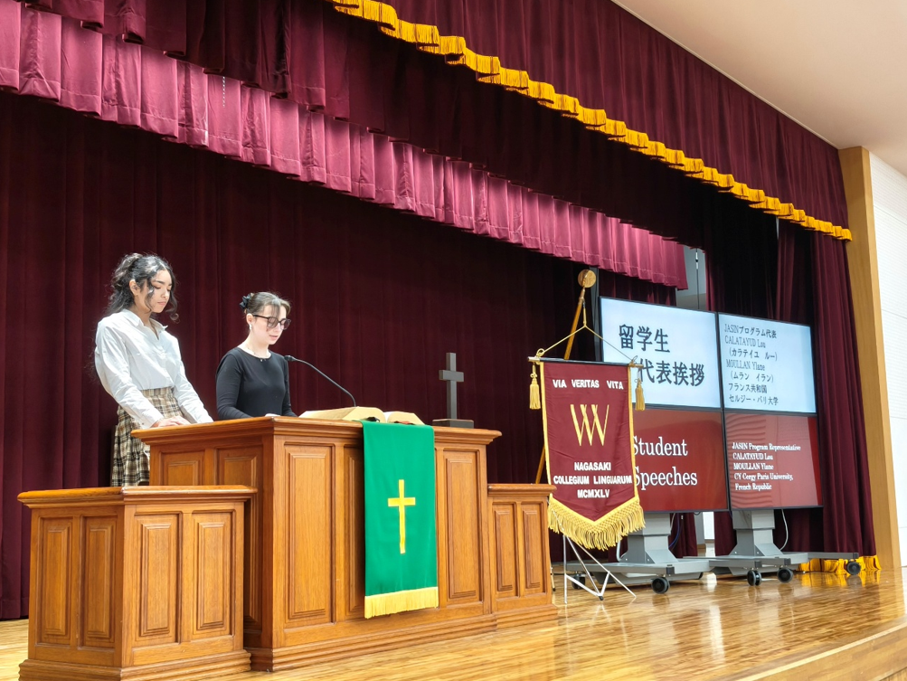 ルーさんとイランさんは、長崎での留学生活を「世界と出会う入り口」と表現し、多様な文化や考え方に触れながら自分自身を見つめ直す貴重な時間を過ごしたこと、また留学を通じて築いた友情や教職員・寮スタッフへの感謝とともに、この経験が今後の人生における大切な財産になったと述べました。