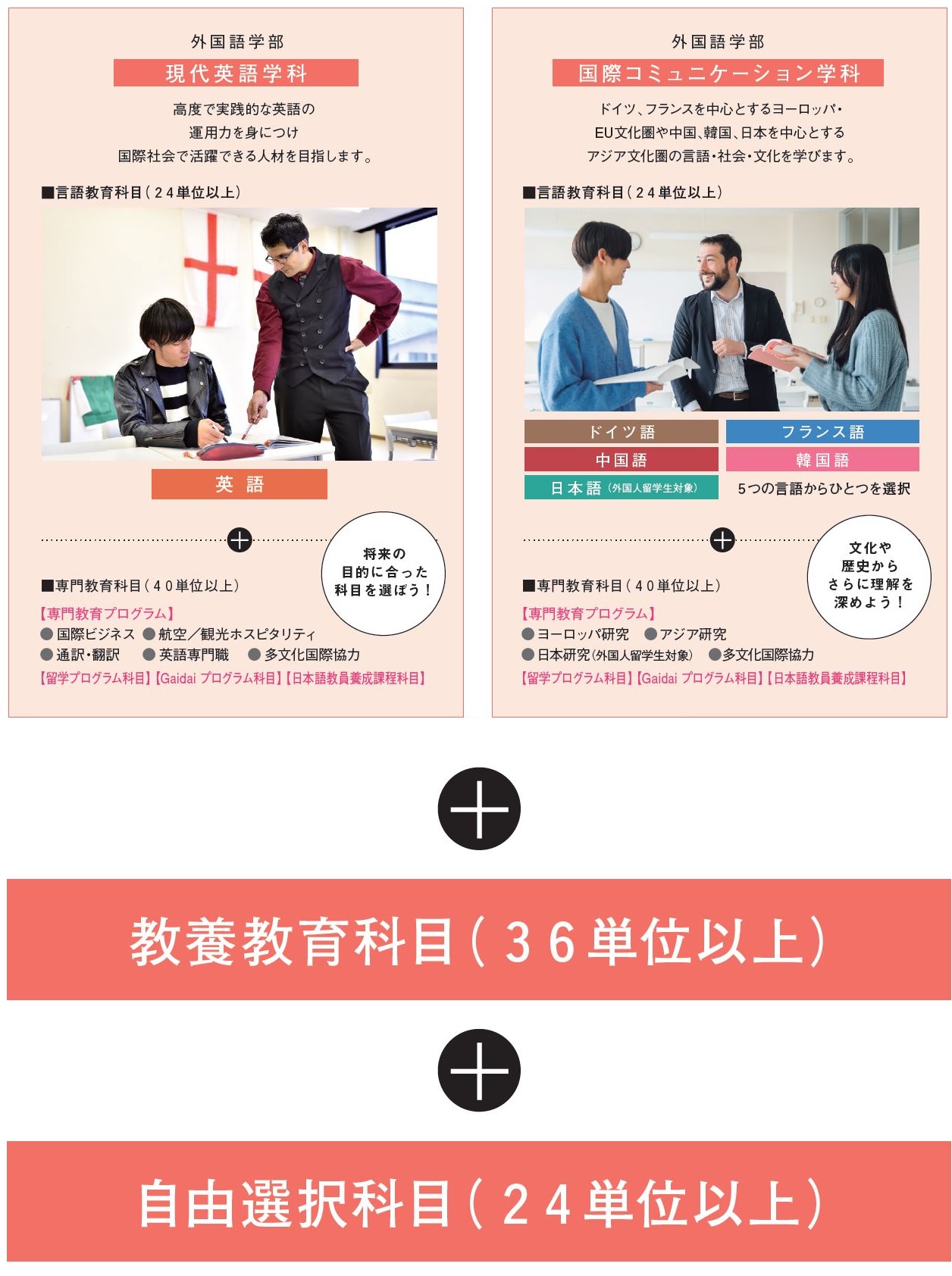 どの言語を中心に学びたいかによって、学科を選択してください。例えば、英語を中心に韓国語も学びたいという人は現代英語学科、ドイツ語を中心に英語も学びたいという人は国際コミュニケーション学科を選択しましょう。 |