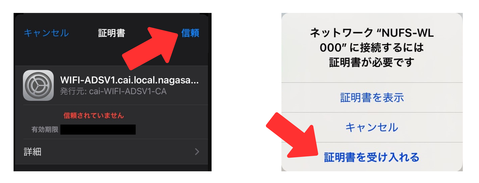 iPhoneやiPad、Macbook等で、Wi-Fi利用中に以下の画面が表示される場合があります。この場合、「信頼」や「証明書を受け入れる」を選択して、引き続き利用してください。